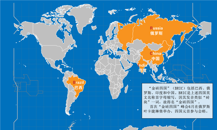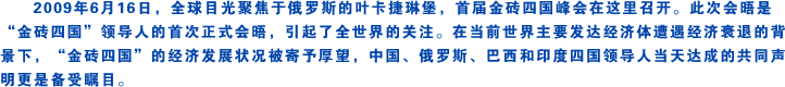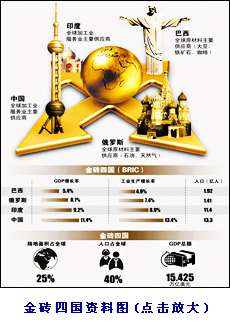 | 從高盛公司在2003年10月提出“金磚四國”概念,5年多后,“金磚”終于從一個(gè)學(xué)術(shù)和新聞概念,上升為外交詞匯。俄羅斯政治基金會(huì)主席尼科諾夫預(yù)言,這個(gè)夏天之后,“金磚四國”將成為一個(gè)“具有超強(qiáng)影響力的、決定21世紀(jì)面貌的機(jī)構(gòu)”。[詳細(xì)] | |