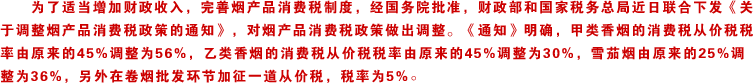 | 此次上調(diào)煙草稅包括三方面的內(nèi)容:上調(diào)煙草生產(chǎn)環(huán)節(jié)的消費稅、在卷煙環(huán)節(jié)加征5%的從價稅和調(diào)整了計稅價格。甲類香煙的消費稅從價稅率由45%調(diào)至56%。原來的甲乙類香煙劃分標(biāo)準(zhǔn)也進(jìn)行了調(diào)整,原來50元的分界線上浮至70元。[詳細(xì)] | |