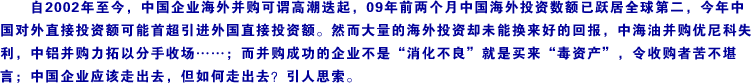 價值從歷史高點下跌了約40%,但同期中國企業(yè)的國內(nèi)并購交易額卻增長了約10%。 中國國內(nèi)并購活動持續(xù)增長的原因有二。第一,政府主導(dǎo)了很多國有企業(yè)為龍頭的行業(yè)整合。當前的經(jīng)濟困難正讓政府有機會促成一些過去可能受到抵制的整合交易。第二,資產(chǎn)負債狀況良好的中國企業(yè)抓住機遇收購實力較弱的本地企業(yè)。與2008年國內(nèi)并購交易的紅火相比,中國企業(yè)在國外的并購清淡了許多。[詳細] | | | |