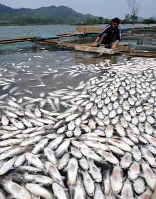 3月29日,一名為養(yǎng)殖戶龍鳳瓊養(yǎng)魚的農民在清理死魚。龍鳳瓊所養(yǎng)的魚目前已死亡近4萬公斤。