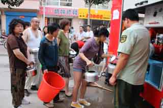 7月28日,內蒙古赤峰市新城區(qū)居民排隊在消防車旁接飲用水。
