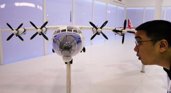 9月23日,一名參觀者被中國(guó)航空工業(yè)集團(tuán)展出的飛機(jī)模型吸引。 新華社記者 王建華