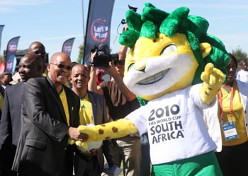 南非總統(tǒng)祖馬(前左)與南非世界杯吉祥物豹娃“扎庫米”握手。新華社發(fā)(梁銓