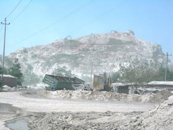 據(jù)《經(jīng)濟(jì)參考報(bào)》記者了解,由于礦產(chǎn)資源豐富,上世紀(jì)80年代初,三河市段甲嶺鎮(zhèn)周邊相繼出現(xiàn)私挖濫采礦石現(xiàn)象,大量白云石礦和石灰石礦等資源遭非法開(kāi)采,從最初的幾家不成規(guī)模的小廠,到現(xiàn)在已經(jīng)“遍地開(kāi)花”。 在段甲嶺鎮(zhèn)到蔣福山村,距離只有7公里,《經(jīng)濟(jì)參考報(bào)》記者發(fā)現(xiàn)路兩旁到處是采石場(chǎng)在作業(yè),路上有載重石料車經(jīng)過(guò)時(shí),過(guò)往車輛不得不避開(kāi),停在路旁!耙?yàn)楣纹鸬姆蹓m根本看不到對(duì)面是否有車輛出現(xiàn)。很多車輛白天不得不開(kāi)著燈,或者打開(kāi)急閃!碑(dāng)?shù)匾晃怀鲎廛囁緳C(jī)坦言。 據(jù)蔣福山村居民韓建財(cái)介紹,礦區(qū)緊挨著村莊,采礦企業(yè)炸山碎石作業(yè)讓當(dāng)?shù)鼐用窀静荒苷I,“有時(shí)夜里剛剛?cè)胨魂囖Z鳴的炸山聲音把你驚醒,像地震一樣,房子都有點(diǎn)晃,你還敢睡嗎?” 在該村通往段甲嶺鎮(zhèn)的路上記者看到,很多轎車都覆蓋上了一層白色粉末,沿途有騎自行車的居民全部將臉包裹得嚴(yán)嚴(yán)實(shí)實(shí),街道兩旁的房頂長(zhǎng)期堆積著礦區(qū)飄下來(lái)的白色粉末。 在小九百戶村,70歲的居民吳長(zhǎng)發(fā)介紹說(shuō),早些年,礦山未開(kāi)采時(shí),家房后的山脈一片綠色,很多居民茶余飯后都到馬路旁“侃大山”,“現(xiàn)在根本不敢在外面長(zhǎng)時(shí)間停留,更別說(shuō)聊天了!逼淦薹Q,現(xiàn)在洗衣服根本不敢往院子里晾曬,曬過(guò)一個(gè)小時(shí),剛洗的衣服又是一層礦山灰!扒澳晡覀兇搴芏鄫D女聚集到一起,開(kāi)始上路攔車,不讓拉石料的車通行,一會(huì)的功夫堵了幾百輛車,后來(lái)政府出面,給村里每人發(fā)100元‘污染費(fèi)’! 除了日常生活受到影響外,村民的農(nóng)作物也深受粉塵之害。村民李先生介紹說(shuō),每年果樹(shù)開(kāi)花授粉時(shí),礦山粉塵和花粉攪和在一起,使果園嚴(yán)重減產(chǎn),成熟的蘋(píng)果因?yàn)殚L(zhǎng)年覆蓋粉塵,所以都有褐色斑點(diǎn),在市場(chǎng)上根本賣不上好價(jià)錢。 《經(jīng)濟(jì)參考報(bào)》記者在采訪中發(fā)現(xiàn),礦區(qū)的粉塵污染不僅僅在生產(chǎn)環(huán)節(jié),石料的運(yùn)輸車運(yùn)輸過(guò)程中產(chǎn)生的二次揚(yáng)塵也尤為嚴(yán)重。 事實(shí)上,來(lái)自三河市交通局的信息顯示,該市現(xiàn)在專門從事礦山石料運(yùn)輸?shù)能囕v就達(dá)近7000輛。一般加長(zhǎng)的載重車每次要拉石料50噸以上,因?yàn)槌d,石料灑落現(xiàn)象嚴(yán)重,過(guò)往車輛經(jīng)過(guò)將剛剛灑落的粉末卷起,到處亂飛。 對(duì)于村民反應(yīng)的情況,記者在102國(guó)道上亦有體會(huì),本來(lái)在三河市市區(qū)天氣晴朗,藍(lán)天白云,可是向東5公里進(jìn)入黃土莊鎮(zhèn)轄區(qū)時(shí),就像北京的“沙塵暴天氣”一樣,天空昏黃,地面上能見(jiàn)度極低。 在當(dāng)?shù)卣ぷ鞯膯滔壬Q,每天上班經(jīng)過(guò)黃土莊到段甲嶺一帶,開(kāi)車不得不減慢速度,因?yàn)楣飞蠠熿F彌漫,經(jīng)常有交通事故發(fā)生。 據(jù)居民吳長(zhǎng)發(fā)介紹,幾年來(lái)該村適齡的年輕人沒(méi)有一個(gè)入伍參軍的,因?yàn)榉尾块L(zhǎng)期吸入粉塵,導(dǎo)致肺部感染嚴(yán)重,“孩子想?yún)④婓w檢都不合格”,吳的觀點(diǎn)在該村其他居民那里得到證實(shí)。 《經(jīng)濟(jì)參考報(bào)》記者實(shí)地調(diào)查得知,蔣福山村、小九百戶村、大九百戶村等20余個(gè)村莊都不同程度遭受當(dāng)?shù)氐V山企業(yè)粉塵污染。