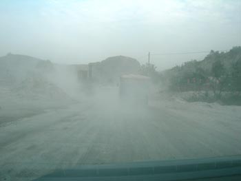 石料車經(jīng)過(guò),路上能見(jiàn)度極低。 |