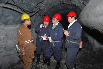 雞西分公司總經(jīng)理孫若山(左二)在井下考問(wèn)工人安全生產(chǎn)知識(shí)。(資料照片) |