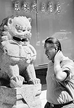 | 一位老人無奈地路過一家醫(yī)保定點(diǎn)藥店。安心 攝 | 退休老人異地醫(yī)保