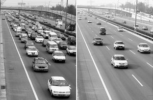 北京:?jiǎn)坞p號(hào)車(chē)輛上路試運(yùn)行,交通狀況有所改善。圖為北京東四環(huán)小武基橋區(qū)的車(chē)流。左圖攝于8月16日8時(shí)24分,右圖攝于8月17日8時(shí)17分。卓恩森攝 |