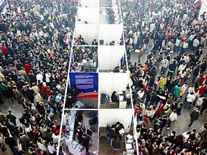 十一月二十日,江蘇省首場面向二〇〇八屆高校畢業(yè)生的招聘會現(xiàn)場依然人山人海。本報記者