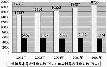 目前,養(yǎng)老保險(xiǎn)已經(jīng)實(shí)現(xiàn)廣覆蓋。到2006年底,全國基本養(yǎng)老保險(xiǎn)參保人數(shù)為18766萬人,城鎮(zhèn)參加企業(yè)基本養(yǎng)老保險(xiǎn)覆蓋率達(dá)到76%。而且,基本養(yǎng)老金正常調(diào)整機(jī)制建立了起來。1998—2005年,企業(yè)參保離退休人員人均養(yǎng)老金水平由每月413元增加到719元,年均增長8.2%。2006年,中央決定較大幅度地提高企業(yè)退休人員基本養(yǎng)老金,當(dāng)年月人均養(yǎng)老金達(dá)到815元。另外,統(tǒng)籌層次正逐步穩(wěn)定提高。截至2006年底,全國已有北京、天津、吉林、黑龍江、上海、福建、重慶、云南、陜西、甘肅、青海、寧夏、新疆13個(gè)省區(qū)市實(shí)現(xiàn)了省級(jí)統(tǒng)籌。但是,農(nóng)村養(yǎng)老保險(xiǎn)的推進(jìn)比較緩慢,覆蓋面還比較小。