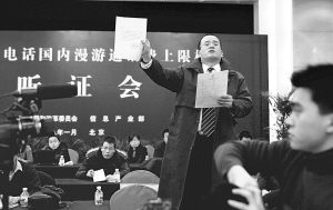 1月22日,“降低移動(dòng)電話國內(nèi)漫游通話費(fèi)上限標(biāo)準(zhǔn)聽證會”在北京舉行。在會后的新聞發(fā)布會上,因申請旁聽此次聽證會遭拒的法學(xué)碩士郝勁松突然跳上桌椅發(fā)問。本報(bào)記者