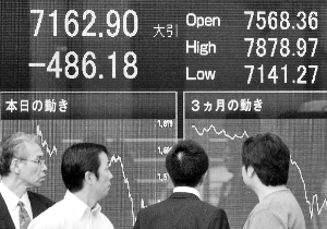 前一天暴跌9.6%的日本股市27日再遭重挫,股指大跌逾6%,收在26年來最低點。截至27日收盤,日經225指數(shù)跌486.18點,跌幅達6.4%,報7162.90點,為1982年10月7日以來最低收盤價。上周五,該指數(shù)暴跌9.6%,至五年半低點。 個股中,大型銀行股成為下跌主力。上周末有報道稱,日本幾大銀行正在考慮采取戰(zhàn)略性舉措來補充資本金。這些措施可能會稀釋現(xiàn)有股權,因而引發(fā)了更多拋售。 三菱日聯(lián)金融收盤狂瀉15%,至上市以來新低。瑞穗金融集團跌15%,三井住友金融跌12%。在三大銀行大跌拖累下,東證指數(shù)銀行分類指數(shù)當天收跌12.5%。 盡管日本經濟增長放緩,但日本的金融體系迄今為止并未受到金融危機最嚴重沖擊,該國的銀行業(yè)也并未爆發(fā)大型破產事件。但是,連續(xù)跳水的股市卻正在給日本的銀行帶來壓力,本月以來,日股市值已損失三分之一,可能成為有史以來損失最慘重的一個月。 日本媒體周末披露,股市暴跌不可避免地給金融機構帶來了巨大投資損失,為此,三菱日聯(lián)、瑞穗金融和三井住友三大銀行正在尋求巨額融資。 報道稱,日本最大銀行三菱日聯(lián)可能需要融資1萬億日元(108億美元)以充實資本;而緊隨其后的瑞穗金融和三井住友則可能各自尋求融資5000億日元(54億美元)。