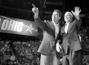 | 31日,美國(guó)加利福尼亞州州長(zhǎng)阿諾德·施瓦辛格(左)出席共和黨總統(tǒng)候選人麥凱恩在俄亥俄州哥倫布市舉行的競(jìng)選活動(dòng)