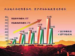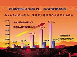 北京注協(xié)以高度的責(zé)任感和使命感,以科學(xué)的管理意識和誠信務(wù)實的工作作風(fēng),引領(lǐng)北京注冊會計師、注冊資產(chǎn)評估師行業(yè)朝著良性發(fā)展的方向發(fā)展,行業(yè)規(guī)模得以迅速壯大,位居全國行業(yè)領(lǐng)先地位。截至2006年底,北京注協(xié)共有會計師事務(wù)所428家,注冊會計師10799人,分別比上年增長15%和8%;資產(chǎn)評估機構(gòu)254家,注冊資產(chǎn)評估師2938人,分別比上年增長9%和6%;2005年度行業(yè)收入合計44.6億元,其中會計師事務(wù)所業(yè)務(wù)收入39.7億元,資產(chǎn)評估機構(gòu)業(yè)務(wù)收入4.9億元,比上年增長21%。在中國注冊會計師協(xié)會公布的2006年全國會計師事務(wù)所業(yè)務(wù)收入排名“百強”中,北京地區(qū)占據(jù)42家,其中7家進入前10名。自2000年以來,業(yè)務(wù)收入連續(xù)位居全國前列,各種特種執(zhí)業(yè)資格亦獨占鰲頭。