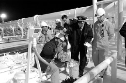 寧波檢驗(yàn)檢疫局工作人員在大榭口岸進(jìn)行進(jìn)口原油鑒定 |