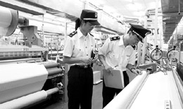 寧波檢驗(yàn)檢疫局工作人員在雅戈?duì)柤瘓F(tuán)有限公司生產(chǎn)車間檢驗(yàn)出口紡織品 |