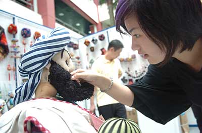 9月19日,展洽活動(dòng)現(xiàn)場(chǎng)新疆婦女手工制作的特色布娃娃吸引了參觀者的眼球。當(dāng)日,全國(guó)婦女“市場(chǎng)帶千村”項(xiàng)目推進(jìn)暨手工制品展洽活動(dòng)在浙江省義烏市小商品市場(chǎng)舉行,來(lái)自全國(guó)31個(gè)省、市、自治區(qū)的婦女代表前來(lái)展示和推介自己的手工制品。 | |