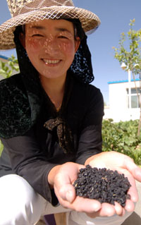 近期,青海省海西蒙古族藏族自治州林業(yè)部門在野外意外發(fā)現(xiàn)稀有野生黑果枸杞。據(jù)了解,枸杞共有紅、黃、黑三種,其中野生黑果枸杞因粒大、肉厚、質(zhì)地柔潤(rùn)、味甜不苦、藥用價(jià)值高,屬枸杞類質(zhì)量最好的一種。6月16日,一名當(dāng)?shù)鼗刈鍕D女在自家院落內(nèi)展示自己采摘并晾曬干的稀有野生黑果枸杞。