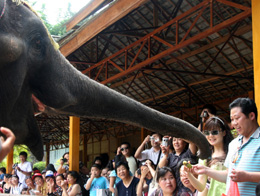 今年上半年,云南省西雙版納傣族自治州接待國內(nèi)外游客人數(shù)突破300萬人次,超過2006年全年游客人數(shù),旅游業(yè)收入大幅提升。圖為游客在西雙版納野象谷與大象同樂。