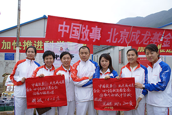 4016床棉被、1700套MP3和300張成龍奧運專輯CD,這批由北京奧組委“中國故事”核心運行團(tuán)隊、北京成龍慈善基金會,聯(lián)合四川省扶貧基金會捐贈的慈善物資,于10月25日被送往綿陽市長虹集團(tuán)培訓(xùn)基地的北川中學(xué)、江油雁門鎮(zhèn)中學(xué)和劍閣縣政府。 據(jù)“中國故事”核心運行團(tuán)隊工作人員介紹,在奧運會舉辦前期,就曾邀請北川中學(xué)的部分師生前往北京參觀鳥巢、水立方以及參與奧運文化活動,當(dāng)時他們與孩子們約定,奧運會結(jié)束后,一定來四川看望他們。4016床棉被是2008的兩倍數(shù),象征著2008年北京奧運和2008年北京殘奧會對四川地震災(zāi)區(qū)的關(guān)懷和援助。此次捐給災(zāi)區(qū)的物資費用全部由成龍慈善基金會承擔(dān)。
