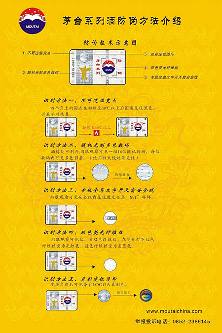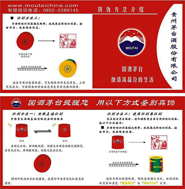 據(jù)悉,從2009年起,貴州茅臺酒、茅臺王子酒、茅臺迎賓酒將全部采用新的先進的防偽包裝,此舉將從包裝源頭上堵死不法分子利用回收舊包裝物造假賣假的渠道,維護廣大消費者的正當權(quán)益。 此次貴州茅臺酒采用的包裝技術(shù)和包裝材料,與以往采用的防偽技術(shù)和材料相比較,既全面提高了防偽的科技含量等級,又便于消費者在購買茅臺酒時自行鑒別。貴州茅臺酒采用的防偽包裝,被稱之為“3+2+1防偽膠帽”,具有三項“二線防偽”、兩項“一線防偽”和一項“特服密碼”的高科技技術(shù),是集我國多位資深專家之智研究開發(fā)的科技成果。其防偽技術(shù)均為世界領(lǐng)先水平,曾經(jīng)獲得國家認證的專利技術(shù)20余項,并先后得到國家及省部級頒發(fā)的獎勵達34個。此項防偽技術(shù),目前在中國酒類行業(yè)內(nèi),僅為國酒茅臺享用。 今后,消費者在購買茅臺酒時,只要手持酒瓶對膠帽的頂蓋及側(cè)面進行肉眼察看,就可以看到膠帽的色彩與標簽在不同角度下所產(chǎn)生的微妙變化,并憑借自身的視覺能力鑒別出產(chǎn)品的真?zhèn)巍>唧w識別方法是—— 膠帽整體:外觀為亞光磨砂紅色,并能在光強條件下產(chǎn)生明顯的珠光效果。 側(cè)面部位:在順光方向,“國酒茅臺”四字和廠徽(LOGO)圖案為明亮的珠光增強色;而在逆光方向,該圖文的色彩就顯得相對很淡。 頂蓋部位:從垂直方向看,膠帽頂蓋中央即呈現(xiàn)出一個亞光紅色齒輪圓型圖案,在圖形中央有亞光紅色燙金五星圖案。 消費者若使用防偽識別器進行識別,則可手持防偽識別器貼近眼部,按動開關(guān)后即能夠觀察到膠帽上的“國酒茅臺”四字和廠徽(LOGO)圖案及色彩消失,出現(xiàn)彩虹狀背景和黃色“國酒茅臺”及“MOUTAI”文字;從垂直方向觀看膠帽頂蓋部位,可見套帽頂部呈亮黃色,上有黑色浮點可隨套帽的轉(zhuǎn)動在亮黃色背景范圍內(nèi)漂移。 茅臺酒此次啟用的防假防偽包裝,其高科技含量集中地體現(xiàn)在酒瓶的防偽膠帽上,凸顯了一種“人無我有,人有我精”的人性化設(shè)計、差異化優(yōu)勢、一體化功能、防偽防剪防回收的獨特功能。 所謂“人性化設(shè)計”,是指消費者開瓶時不用再像以往那樣費力地去撕脫瓶蓋膠帽,而只需要像撕開煙盒塑膜封裝一樣,輕輕地一扯,即可卸除密封于酒瓶蓋上的膠帽,并同時撕破防偽標簽。 “差異化優(yōu)勢”是指,現(xiàn)今在中國酒類企業(yè)中“貴州茅臺”采用此種具有領(lǐng)先性的防假防偽技術(shù),這就為國酒茅臺打擊假冒侵權(quán)不法行為的工作提供了高科技支撐。 “一體化功能”是指,茅臺酒的包裝膠帽一經(jīng)套上瓶口,即與酒瓶天衣無縫地融合為一體,開瓶便一次性毀壞膠帽,無從復(fù)原。 “三防功能”是指,因防偽、防剪和防回收而采取的特殊制造技術(shù),使那些企圖剪取茅臺酒防偽商標、回收舊酒瓶的造假者失去了制假的條件。 而茅臺王子酒和茅臺迎賓酒則首次采用具有高科技含量的防偽包裝,這是基于已對這兩款茅臺系列產(chǎn)品實施全面提質(zhì)升級換代之后采取的體現(xiàn)國酒茅臺“顧客價值”創(chuàng)新的一個重要舉措。 據(jù)悉,茅臺王子酒、茅臺迎賓酒其防偽標簽有五個特征。這就是:(1)“不可逆溫變點”識別——四個角上的圓點在加熱到60度后,以上圖案呈黑色,并且不可恢復(fù)。(2)“隨機光刻多色數(shù)碼”識別——標簽酒樽處刮開后用肉眼觀察,即見一組16位隨機數(shù)碼,每位數(shù)碼內(nèi)可見多色彩條(使用放大鏡觀察,效果更佳)。(3)“專版全息文字開天窗安全線”識別——肉眼可看見安全線內(nèi)呈現(xiàn)激光全息“MT”字樣。(4)“雙色熒光纖維絲”識別——在熒光燈下肉眼可見,紅色纖維絲變?yōu)榱良t色,藍色纖維絲變?yōu)榱了{色。(5)“真彩定位燙印”識別——變換角度后可見茅臺“LOCO”為真彩色。 面對當今國內(nèi)白酒市場存在的假冒侵權(quán)不法行為,國酒茅臺不惜重金投入開發(fā)、采用具有國際先進科技水平的防偽包裝,無疑是充分體現(xiàn)科學(xué)發(fā)展觀、體現(xiàn)以人為本、視消費者為上帝、維護消費者權(quán)益的一個重要舉措。