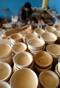 近年來,隨著大批游客的到來,云南省迪慶藏族自治州藏族獨具民族特色的民間手工藝品和藝術(shù)品頗受青睞。圖為一位工匠在香格里拉縣的藏族村莊中加工木碗。