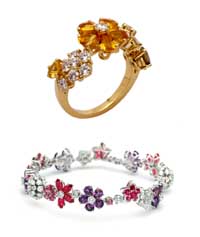 為了營造別具特色的色調(diào)效果,工匠創(chuàng)造出了三種與鉆石相配合的和諧色:粉藍寶石配鉆石;粉紅色及淡紫色寶石配鉆石;橘黃色及綠色寶石配鉆石。柔和的淡粉紅色與更加鮮艷的深粉紅色形成對比,襯托出淡紫色寶石的美麗;黃色到綠色的漸變差異營造出了看似單色的效果。這些具有細微差別的半寶石被挑選出來,在每件單品上變換不同色彩以重新塑造野花的和諧與雅致之美。 |