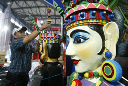 2006中國(guó)國(guó)際旅游交易會(huì)于11月16日在上海開(kāi)幕。已成功舉辦了七屆的這一交易會(huì)是亞洲地區(qū)規(guī)模最大、專(zhuān)業(yè)性和國(guó)際化程度較高的旅游盛會(huì)。圖為11月15日印尼展團(tuán)的工作人員正在布展。