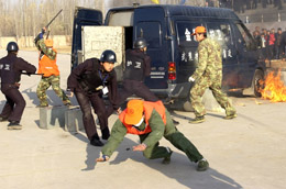 11月21日,參加反搶劫演練的保安與企圖搶劫押運(yùn)車的“犯罪分子”搏斗。 當(dāng)日,寧夏金融單位保安押運(yùn)反搶劫演練在武警寧夏總隊(duì)西沙窩訓(xùn)練場(chǎng)舉行,10家金融單位和7家保安押運(yùn)公司人員參加了演練。