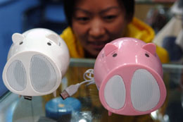 日前,在江蘇無錫一家商城,一位女孩被小豬造型的收音機(jī)所吸引。這種小豬造型的收音機(jī)不僅能收聽廣播,還可與MP3、MP4播放器或電腦等設(shè)備連接,作為音箱使用,受到年輕人喜愛。