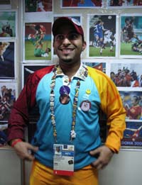 12月9日,多哈亞運(yùn)會(huì)的志愿者伊沙克在展示他收集到的徽章。亞運(yùn)會(huì)賽場(chǎng)內(nèi)外,不少志愿者、運(yùn)動(dòng)員熱衷于收集、交換徽章,通過(guò)一枚枚小小的徽章,來(lái)自不同國(guó)家的收藏愛好者不但壯大了自己的收藏規(guī)模,也在彼此間傳遞了的友誼。