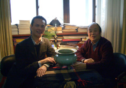 趙青云(右)為歐洲古董經(jīng)紀(左)鑒定宋瓷。 |