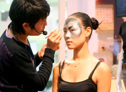 1月31日,一位化妝師在展會現(xiàn)場進(jìn)行流行彩妝展示。當(dāng)日,2007上海美容展在上海新國際博覽中心開幕,來自23個國家和地區(qū)的300多家廠商參展。