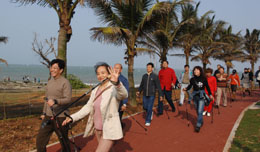 1月27日,海南省探險(xiǎn)協(xié)會(huì)越野行走委員會(huì)組織越野行走愛好者在西海岸進(jìn)行越野行走。該項(xiàng)運(yùn)動(dòng)借助于兩根碳纖維手杖快步行走,健身效果要比一般行走和跑步提高40%左右。
