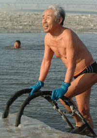 佳木斯冬泳隊最年長79歲的佟德本老人在作冬泳鍛煉。
