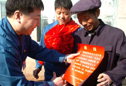 2月12日,中油吉林化建工程股份有限公司獎勵慰問高技能型農(nóng)民工活動啟動,60多名農(nóng)民工受到表彰,并先后在企業(yè)領(lǐng)導(dǎo)的陪伴下載譽還鄉(xiāng)。圖為在吉林省蛟河市天崗鎮(zhèn)崗子村,農(nóng)民工李彥軍(中)的父親李孝富(右)接收中油吉林化建公司送來的喜報。