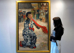 油畫《放下你的鞭子》高1.44米,寬0.9米,徐悲鴻以接近真人的比例,將劇中的主角、著名演員王瑩入畫。畫中,王瑩身穿白底藍(lán)紋服飾,手持紅綢,翩翩起舞,男女老幼神情陶醉地觀看,有的衣衫襤褸,有的著軍服持槍,栩栩如生地再現(xiàn)了抗戰(zhàn)時期的生活狀態(tài)和百姓的沉重心情!