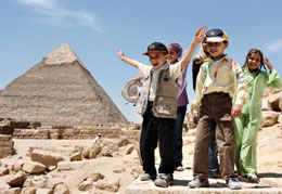 幾名小游客在埃及首都開羅城郊的吉薩金字塔群前游玩。本報(bào)記者:藺以光 攝