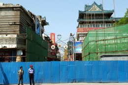 5月9日,昔日繁華的前門大街如今已被施工板擋起。當(dāng)日,北京前門大街兩側(cè)修繕保護(hù)工程全面啟動(dòng)。前門地區(qū)歷史悠久,是老北京市井風(fēng)貌、史跡文物保存最完整的地區(qū)之一,但隨著經(jīng)濟(jì)、社會(huì)和城市建設(shè)的發(fā)展,現(xiàn)有基礎(chǔ)設(shè)施陳舊,安全隱患突出,文物建筑亟須修繕。修繕整治后的前門大街將恢復(fù)清末民初的建筑風(fēng)貌,大街路面換鋪青白石,再現(xiàn)昔日御道風(fēng)采,五牌樓、鐺鐺車、廣和查樓大戲臺(tái)也將重現(xiàn)在人們的視野中,使古都中軸線上最具京味的歷史文化區(qū)域得到有效搶救和保護(hù)。據(jù)了解,崇文區(qū)還將改造大街的水、電、雨、污、燃?xì)獾然A(chǔ)市政設(shè)施,實(shí)現(xiàn)市政設(shè)施的現(xiàn)代化。