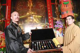 著名金石篆刻家黑石(左)把采用五十三方芙蓉石、雞血石、田黃石和朱砂等中國著名石材,歷時三年篆刻成的藝術品《舍利心經(jīng)》捐贈給陜西法門寺。