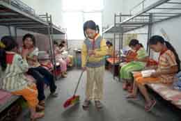 巫溪縣是國(guó)家級(jí)貧困縣,也是目前重慶經(jīng)濟(jì)最落后的縣,境內(nèi)山區(qū)占全縣面積的80%以上,交通十分不便,很多邊遠(yuǎn)小學(xué)生每天上學(xué)往返要走3個(gè)小時(shí)以上的山路。這個(gè)縣從2004年開(kāi)始實(shí)施農(nóng)村寄宿制學(xué)校建設(shè)工程,各級(jí)政府共投入資金近1000萬(wàn)元,建設(shè)與寄宿制教育有關(guān)的項(xiàng)目152個(gè)。目前全縣已有8000多名符合國(guó)家寄宿制規(guī)定單程上學(xué)走5華里以上的小學(xué)生進(jìn)入寄宿制學(xué)校學(xué)習(xí)生活,約占符合該規(guī)定總?cè)藬?shù)的70%,從很大程度上解決了山區(qū)小學(xué)生“上學(xué)難”的問(wèn)題。圖為重慶巫溪縣寧廠(chǎng)僑心小學(xué)的女生宿舍。 |