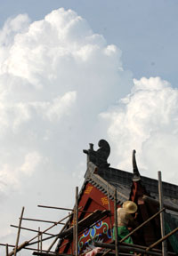 被譽(yù)為“南岳四絕”之一的方廣寺始建于南朝梁天監(jiān)二年(公元五零三年),距今已有1500多年歷史,為南岳衡山歷史最悠久的寺院。但方廣寺因山深路遠(yuǎn),雖聲名遠(yuǎn)播,卻年久失修,成為南岳眾多風(fēng)景名勝中較為荒敗的重要古跡之一。日前,南岳景區(qū)開始對(duì)方廣寺實(shí)施規(guī)模較大的修繕工作,以更好地保護(hù)和開發(fā)這座極具文化和歷史價(jià)值的千年古剎。圖為一名工匠正在對(duì)南岳衡山著名的方廣寺進(jìn)行維修。 |