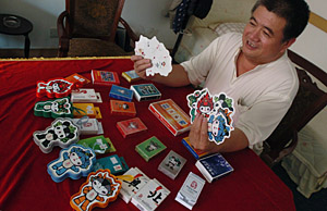 “這些撲克都是我從牙縫里省出來的,心愛得就像自己的孩子”趙玉學(xué)說。 1987年,趙玉學(xué)剛到陽泉鋁業(yè)公司上班,跑采購(gòu)的他“幾乎天天出差”。在外地忙完工作,趙玉學(xué)經(jīng)常買副撲克作為紀(jì)念,他說是因?yàn)椤百I不起別的紀(jì)念品”。隨著撲克增多,上世紀(jì)90年代初,趙玉學(xué)開始專業(yè)收藏?fù)淇恕?BR> 在趙玉學(xué)的藏品中,有十余個(gè)國(guó)家的外國(guó)撲克。1990年,趙玉學(xué)去連云港出差,在一家大超市看到一副日本著名的“浮士繪”撲克。這種反映日本民間藝術(shù)的撲克紙質(zhì)極好,手感光滑如綿,繪圖印刷精美,但一副23元。這樣的價(jià)位,令趙玉學(xué)在這家超市幾進(jìn)幾出。最后,愛牌心切的他還是咬牙買了。現(xiàn)在,趙玉學(xué)已經(jīng)收集了五套不同的“浮士繪”撲克。目前,這種國(guó)內(nèi)很少見的撲克每套售價(jià)在百元以上。 為了收藏?fù)淇,有?5年煙齡、一天抽三包煙的老煙民趙玉學(xué)戒了煙。1992年,為了收集毛主席像剪紙撲克,他一下花掉三個(gè)月的工資。 趙玉學(xué)的親朋好友知道他有這個(gè)愛好,只要出差,總會(huì)給他帶回一些外地?fù)淇。趙玉學(xué)的不少外國(guó)撲克,就是靠這種方法收藏到的。