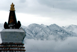 青海湖畔的佛塔與“雪山云!逼嬗^相映成趣。 本報(bào)記者:侯德強(qiáng) 攝 |