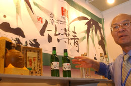 日前于長春召開的第三屆中國吉林·東北亞投資貿(mào)易博覽會上,刮起了濃濃的臺灣美食風(fēng)。由臺北農(nóng)協(xié)組織的30人代表團(tuán)帶來了許多種臺灣食品。圖為一名參展的臺商在介紹一種來自臺灣的美酒。