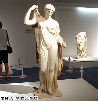 初秋的北京,午后的陽光依然灼熱,長安街一如往常的車水馬龍,在繁華喧囂的街市旁卻有一處能夠讓心靈沉靜下來的空間。首都博物館外,印有巨幅維納斯雕像的海報(bào)吸引著人們走入古典希臘藝術(shù)的殿堂,主題為“古典希臘藝術(shù)”的盧浮宮珍藏展正在這里舉行。 步入首都博物館1400平方米的臨時展廳,四根形似帕特農(nóng)神廟的石柱高高矗立在記者面前,在燈光照射下,帶有黃土一般色彩的柱子散發(fā)著神秘氣息,好似一道穿越時光的大門,邀請人們踏上一場古希臘文化之旅。