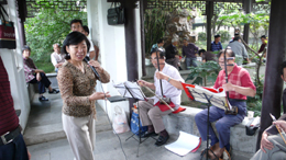 國慶前夕,江蘇省常州市所有公園全部免費(fèi)開放。 為貫徹“民生第一”原則,從2006年,常州市開始將紅梅公園、椿桂園、薔薇園生態(tài)濕地公園、東方綠地公園免費(fèi)開放。2007年,又把新建的荊川公園、青楓公園二期、荷園、武進(jìn)新天地公園、淹城森林公園二期、開花溪公園也全部免費(fèi)開放。至此,常州市的所有公園全部免費(fèi)開放。圖為常州紅梅公園內(nèi)的市民在唱昆曲。 |
