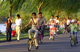 游客騎車游覽杭州西湖白堤景區(qū)。不久,游客就可坐黃包車,賞西湖景。本報記者:徐昱