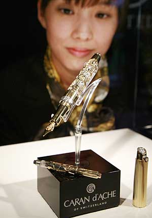 日前,一名工作人員在日本東京展示瑞士生產(chǎn)的價(jià)值17.4萬(wàn)美元的鋼筆“1010”。這款鋼筆用18K金制作,筆帽和筆囊分別鑲嵌了一顆鉆石及一顆紅寶石。據(jù)悉,廠家只生產(chǎn)了10支“1010”限量版鋼筆,其中只有一支投放日本市場(chǎng)。