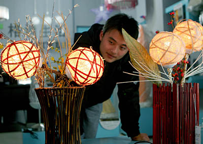 在安徽省淮北市一商店,一位市民在觀看用藤條制作的鏤空裝飾燈。這種藤條制作的燈既環(huán)保又時尚,頗受消費者青睞。